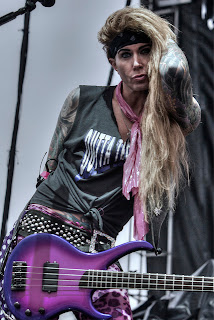 All the while Lexxi was stage left, destroying the ozone layer, applying lip gloss and practicing his best poses in his mirror. He doesn't get to speak much and when he does, you realize quickly that  he's merely there for his unequivocal beauty and his ability to hold down the killer bass lines like a true glam metal rock star.